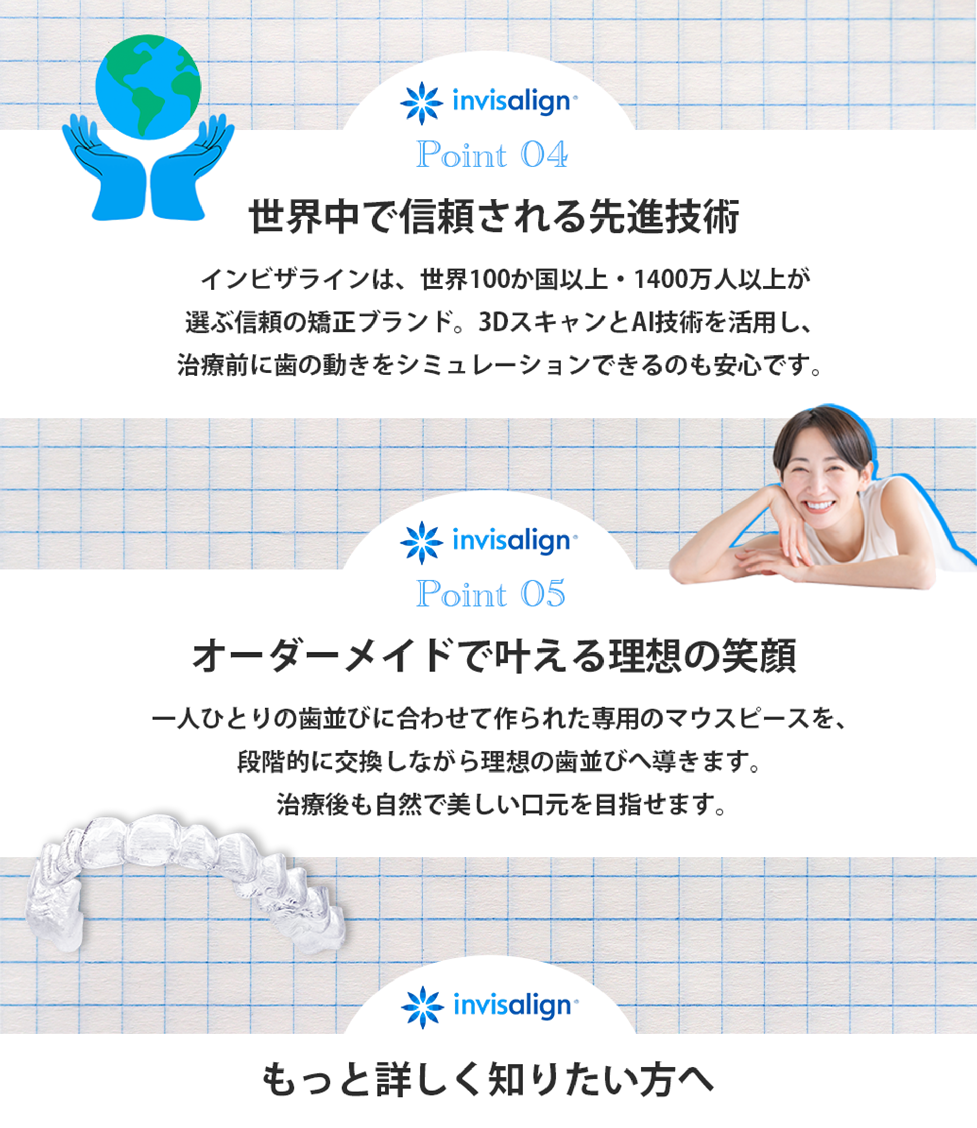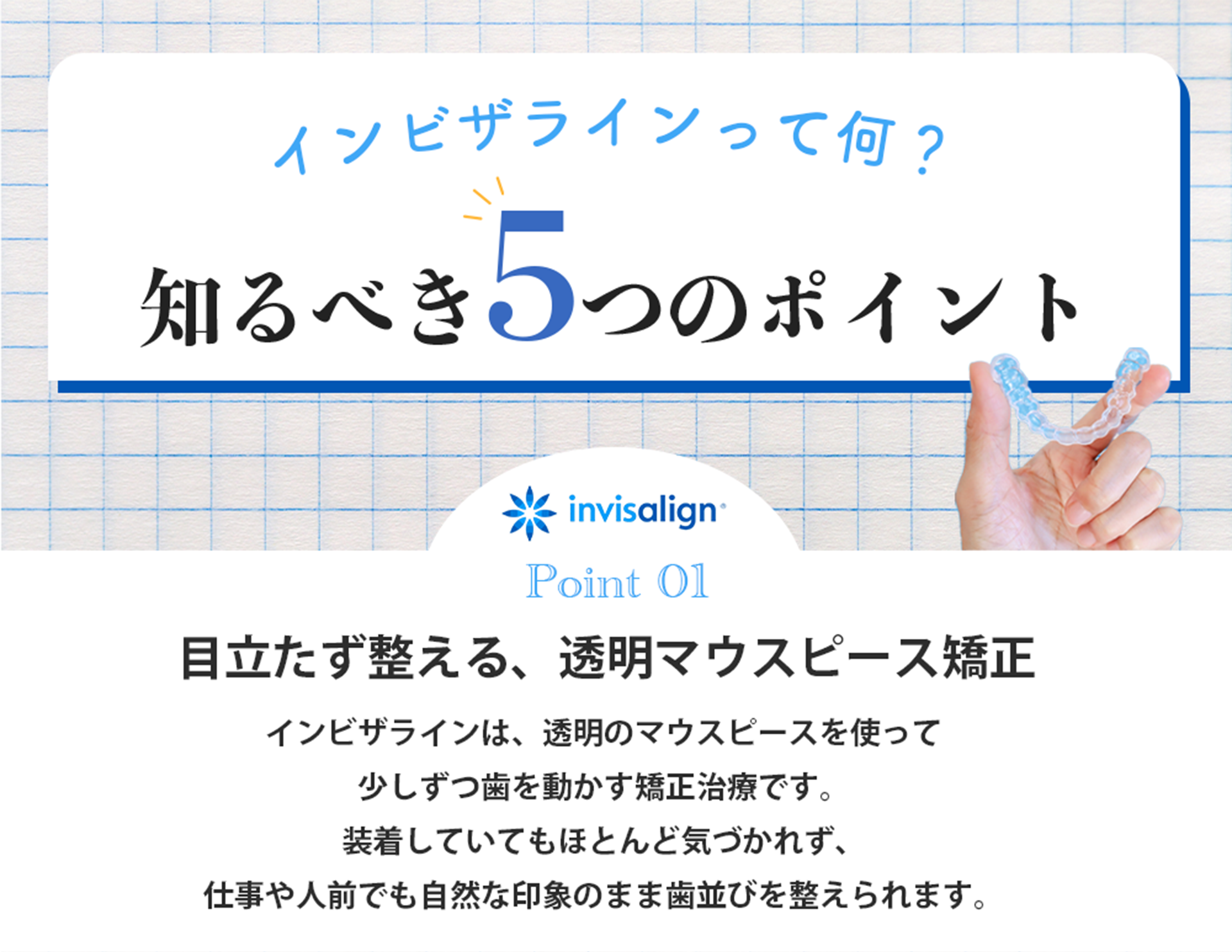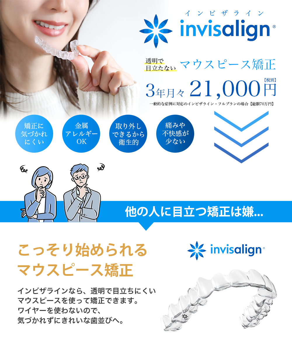 A. 透明のマウスピースを使用するため、近くで見てもほとんど気づかれません。人前に出る仕事の方にも人気があります。